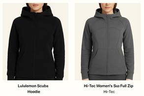- Scuba Hoodie : Le Hi-Tec Men’s Scuba Full Zip vendu par Costco pour 19,97 $ reproduirait les caractéristiques du Scuba Hoodie vendu à plus de 100 $.